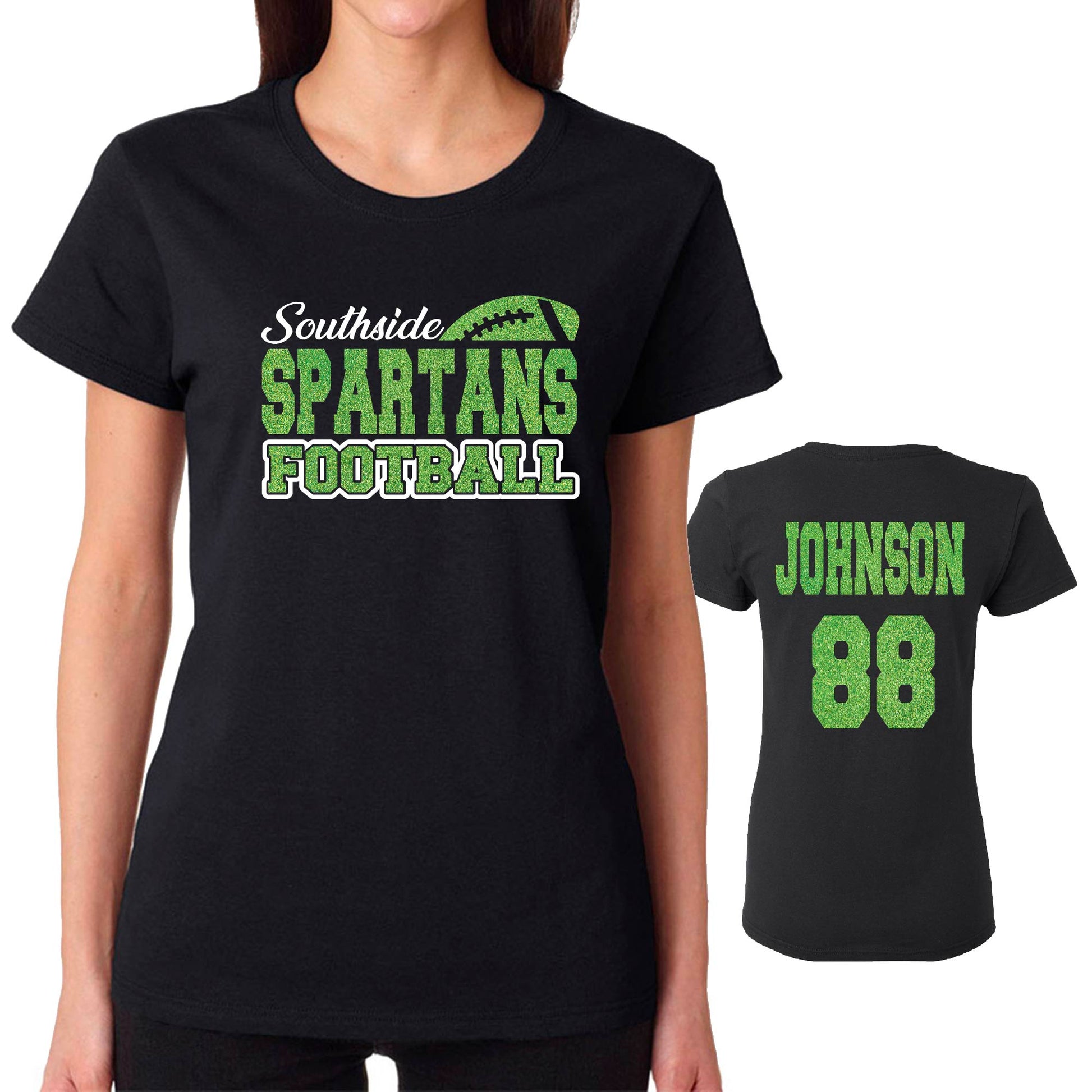 Check out this amazing soft-style Tee Shirt. We only use fashion industry leading, high-quality apparel at the most affordable prices. For this particular listing, I am using a heavy cotton women's style tee for the classic fit and feel of a blue jeans kind of a day. This item allows you to choose the color shirt, glitter color and customize the team and player name and number.