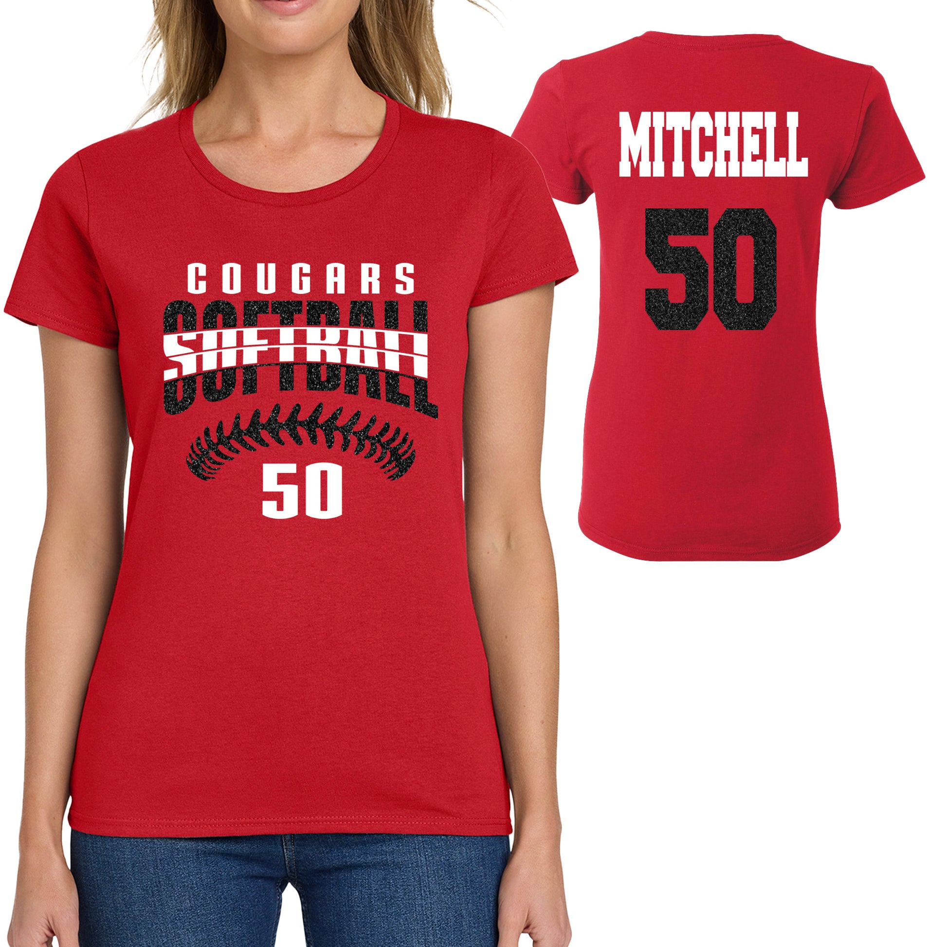 Check out this amazing soft-style Tee Shirt. We only use fashion industry leading, high-quality apparel at the most affordable prices. For this particular listing, I am using a heavy cotton women's style tee for the classic fit and feel of a blue jeans kind of a day. This item allows you to choose the color shirt, glitter color and customize the team and player name and number.